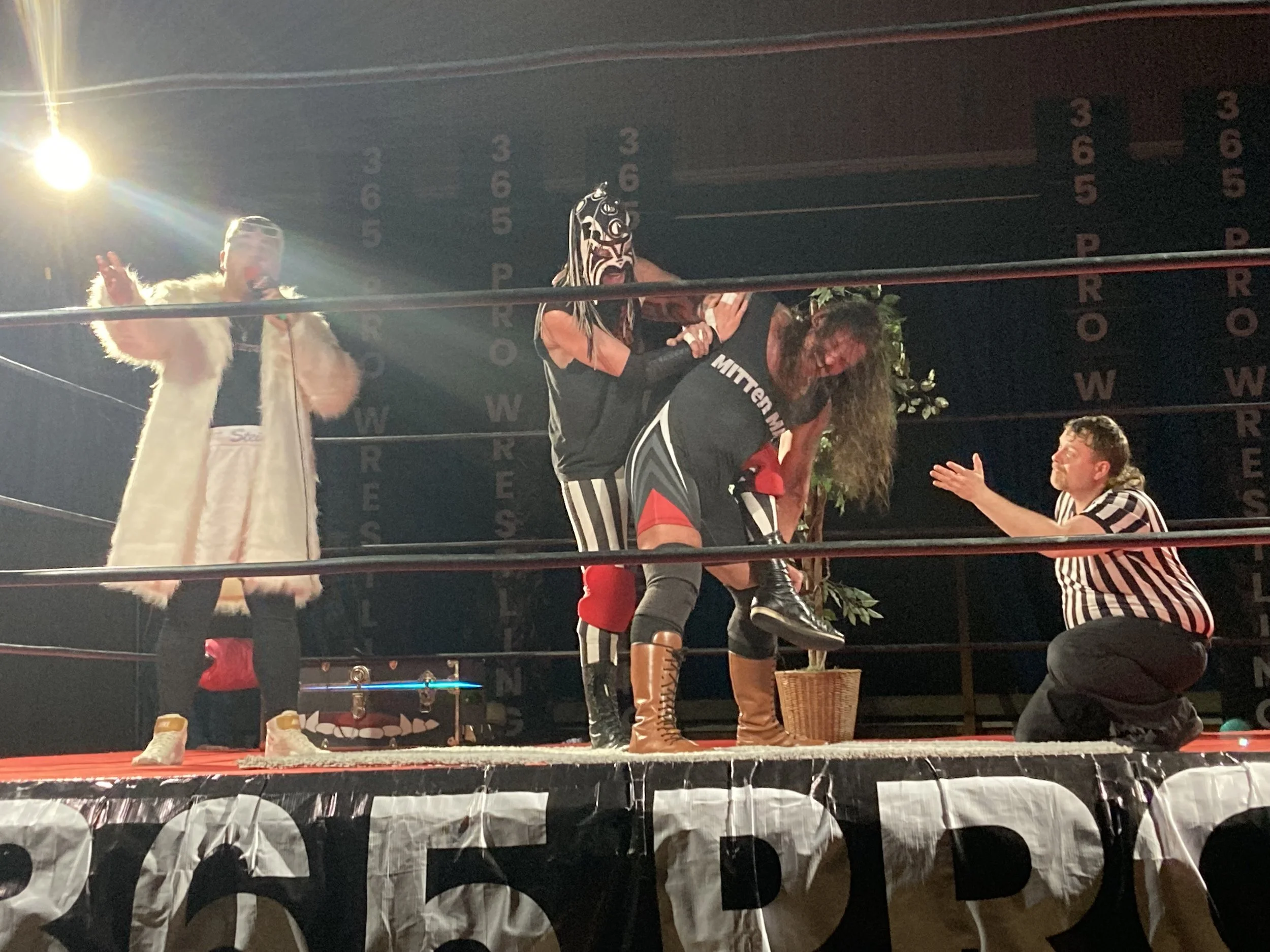 Thelonious declares that he is here to take on the former Fallen Circus teammates all by his lonesome. This will be a handicap match, apparently! Thelonious starts out making Haviko clap against his will. Genuinely funny shit. Thelonious is full of hilarious offence, including a great 10-spot smashing his opponent's head into the turnbuckle. Then the Mitten Train takes off as Thelonious runs from corner to corner only to lay out his enemy with a...double axehandle smash. Haviko and Andrews weather the early Thelonious storm and take control with quick tags and hard offence. Haviko gets Thelonious in the always-devastating abdominal stretch and as Thelonious struggles against the pain, he calls for...STEIN TIME! Out comes the plant and carpet, the set pieces that help bring Stein Time to life and all of a sudden, 365's #1 talk show is happening in the middle of this match! Questions are asked of all participants, including, and especially, those in abdominal stretches. Sawyer ends Stein Time by announcing that he will join Thelonious and turn this handicap match into a proper tag match, quoting the legend Teddy Long in the process. Sawyer gets the hot tag and after battering the once-Fallen Circus, he kisses Petunia! Zack furiously throws Sawyer out of the ring after the kiss and then he and Haviko proceed to get DQed almost immediately as they smash Thelonious into the trunk that is also the gateway to the Fifth Dimension. The win isn't important to Andrews. He's trying to soften up Thelonious for Mitten Mayhem tomorrow...